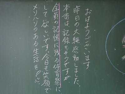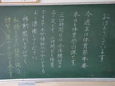 今日は1日曇り空です。昨日延期になった予行が体育祭実行委員の朝早くからの準備によって、実施することができました。