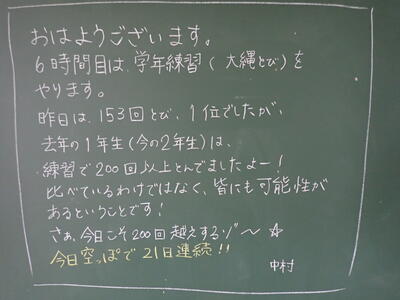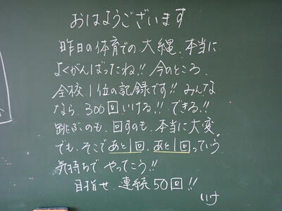 予行の後に、「全校プレ大縄大会」を開催しました。全校一斉で行ったためか、どのクラスも「気持ち」が入り、新記録を出したクラスも多く、300回を超えるクラスが2クラスもありました。