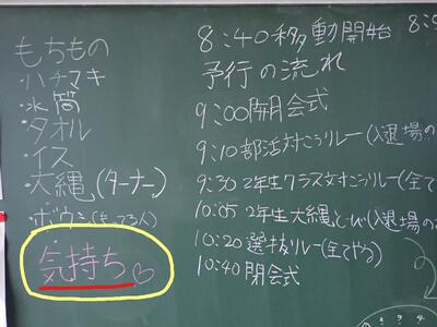 あるクラスの黒板に書かれていました。体育祭実行委員が書いたものです。〈持ち物〉の中の「気持ち」。