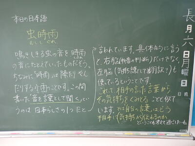 今日の日本語は「虫時雨(むししぐれ)」です。「音を言葉として聞く」昔の人は情緒豊かだったんですね。雨の音を今度じっくり聞いてみましょう。