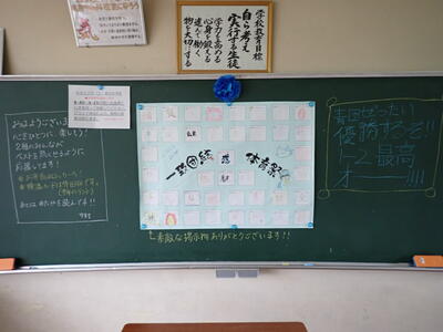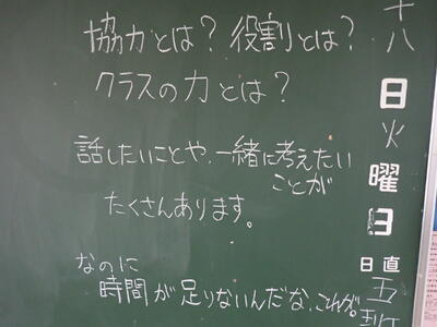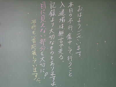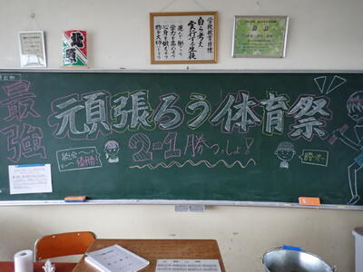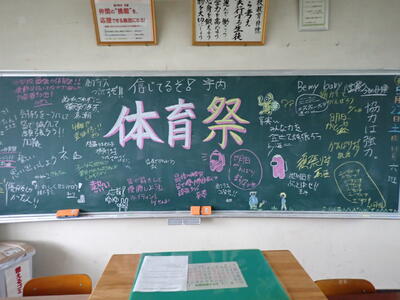 朝、各教室を回っていたら、全てのクラスで体育祭に向けての意気込みが書いてありました。どれだけ熱い思いを持って臨んでいるかがわかります。