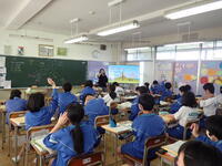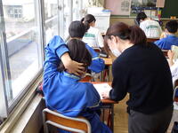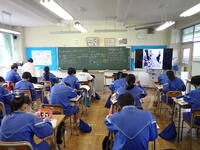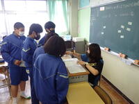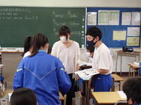 2年生の社会で協調学習(ジグソー法)による授業が行われていました。協調学習とは、「複数の学習者が意見を交換し,協力し合いながら解を導こうとするという学習形態」、要するに「子どもたち同士が教え合い学び合う 」学習のことです。①エキスパート活動(1つの課題について専門的に学習する:今日の場合は「世界の人口」「日本の人口」「日本の人口分布」という課題を班員が1つ担当し、調べ上げる活動)、②ジグソー活動(班員がそれぞれ調べ上げた課題を、ジグソーパズルのようにまとめ上げる活動)、③クロストーク活動(ジグソー活動でまとめた内容で学習課題(日本の人口は、世界と比べてどのような特色があるか?)に迫る活動)という流れで授業を展開しました。生徒は、資料を用いて一生懸命調べたり、調べたものを必死に他の班員に伝えていました。この活動がまさしく対話を通して理解を深めるアクティブラーニング型授業です。