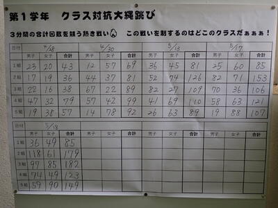 第1位:3年3組315回、第2位:3年1組300回、第3位:2年4組276回、第4位:3年5組253回、第5位:2年2組251回