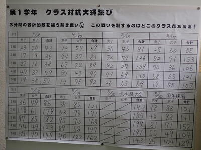 予行の後に、「全校プレ大縄大会」を開催しました。全校一斉で行ったためか、どのクラスも「気持ち」が入り、新記録を出したクラスも多く、300回を超えるクラスが2クラスもありました。