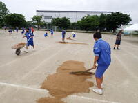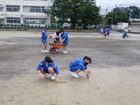 まずは、男女テニス部が校庭の石や草を取り除いてくれました。