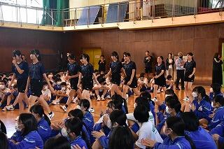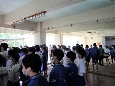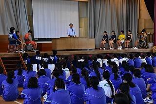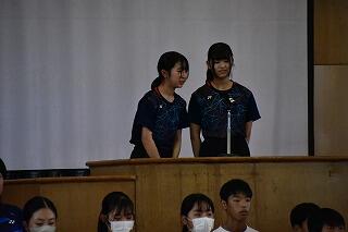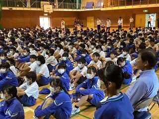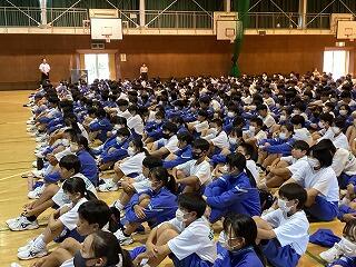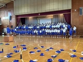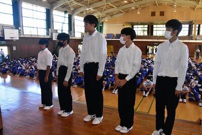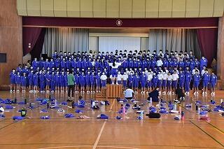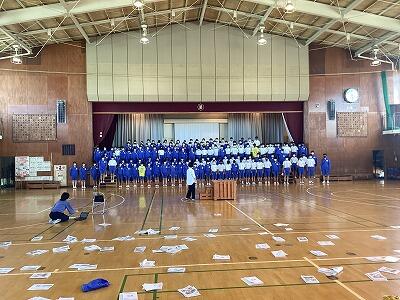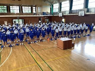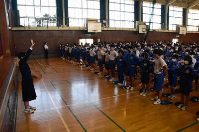 新人戦の県大会に出場することになった生徒のみなさんを全校生徒で応援する壮行会が行われました。各部の代表の言葉や、校長先生のお話、生徒会役員の音頭で、全校生徒と先生方で送った「エール」、体育館いっぱいに響いた校歌。生徒会役員のみなさんが中心に企画した壮行会は、大変心温まる素晴らしい会となりました。