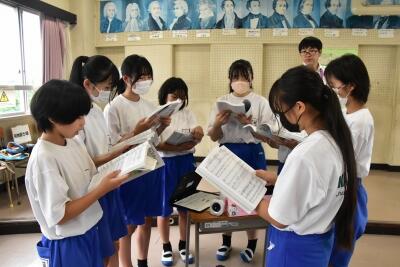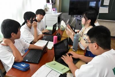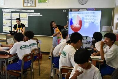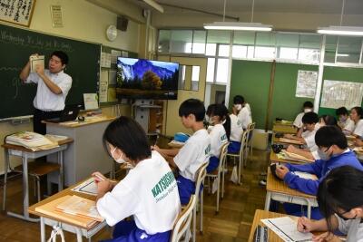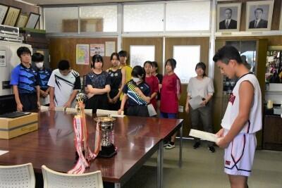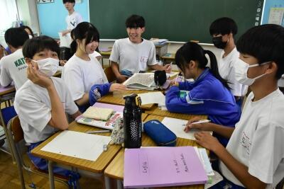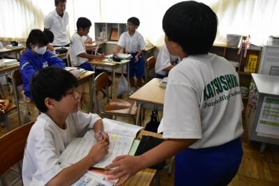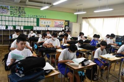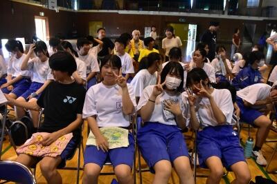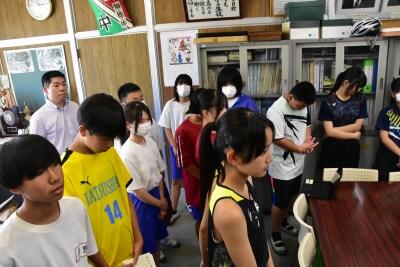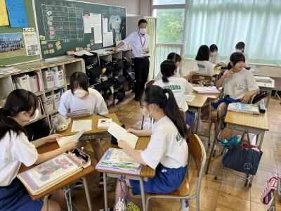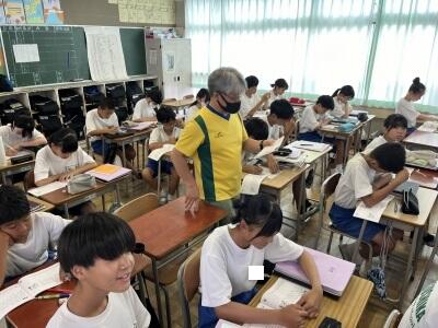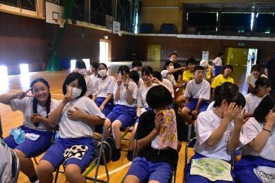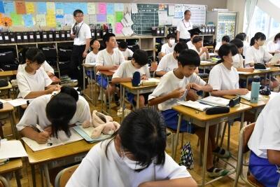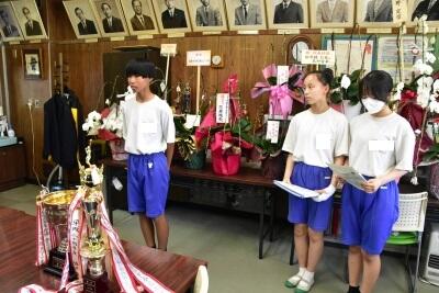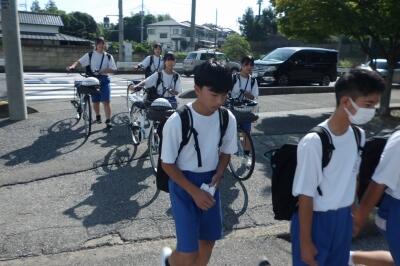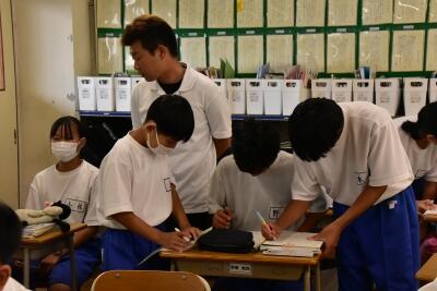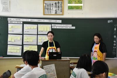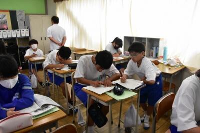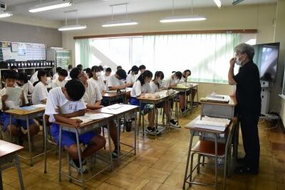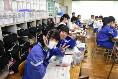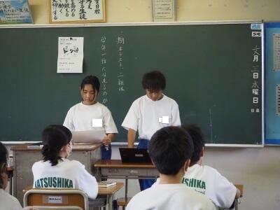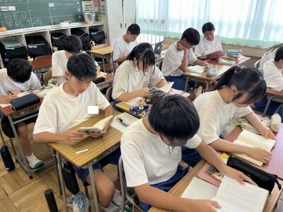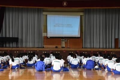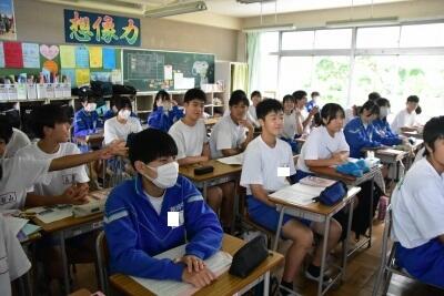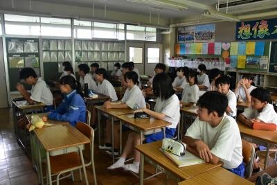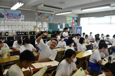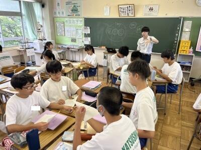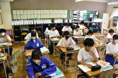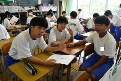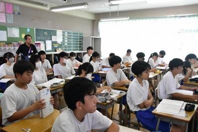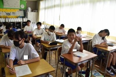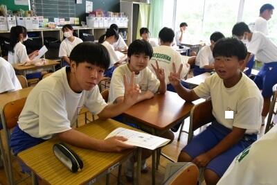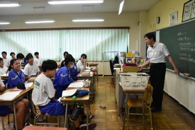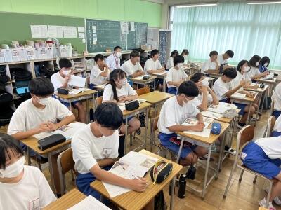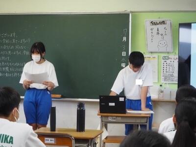 7月第2週がはじまりました。ここまでくると、1学期も残りわずか、夏休みまでカウントダウン状態に入りました。今日も熱中症警戒アラートが発出されました。相変わらずの厳しい暑さで、学校の教育活動が制限されることとなり、生徒・教職員の健康面を筆頭に学校としては大変頭が痛い毎日です。今日は小中学校連携で、双方の栄養教諭による食育の授業が2年生で行われました。この後も、すべての学年で、また、校区内2つの小学校でもこの取り組みによる授業が行われます。暑さに負けない丈夫な身体をつくるために、生涯の中でも著しく成長する大切なこの時期の健康を守るためにとても大切な授業です。生徒のみなさんはしっかり取り組み、ぜひ、家庭でも共有して実践するようにお願いします。また、授業後には暑さ対策のため、オンラインでの実施となりましたが、県大会に出場する部活動への壮行会が行われました。