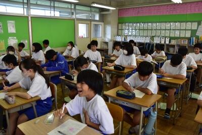 7月第2週がはじまりました。ここまでくると、1学期も残りわずか、夏休みまでカウントダウン状態に入りました。今日も熱中症警戒アラートが発出されました。相変わらずの厳しい暑さで、学校の教育活動が制限されることとなり、生徒・教職員の健康面を筆頭に学校としては大変頭が痛い毎日です。今日は小中学校連携で、双方の栄養教諭による食育の授業が2年生で行われました。この後も、すべての学年で、また、校区内2つの小学校でもこの取り組みによる授業が行われます。暑さに負けない丈夫な身体をつくるために、生涯の中でも著しく成長する大切なこの時期の健康を守るためにとても大切な授業です。生徒のみなさんはしっかり取り組み、ぜひ、家庭でも共有して実践するようにお願いします。また、授業後には暑さ対策のため、オンラインでの実施となりましたが、県大会に出場する部活動への壮行会が行われました。