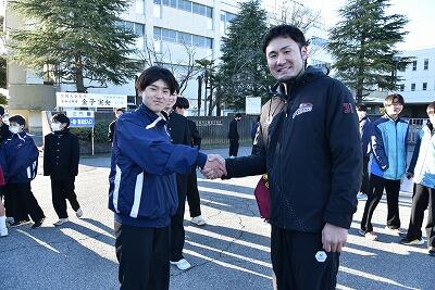今日は春日部市と連携協定を締結している越谷アルファーズから、喜多川 修平選手とチームスタッフの方が『令和5年度「アルファーズ元気キャラバン-朝のあいさつ/春日部編-」の取り組みで葛飾中学校に来てくださいました。葛飾中学校では、生徒会本部役員・バスケットボール部のみなさんが、一緒にあいさつ運動を行い、朝の校門は元気のよい挨拶の声があふれていました。