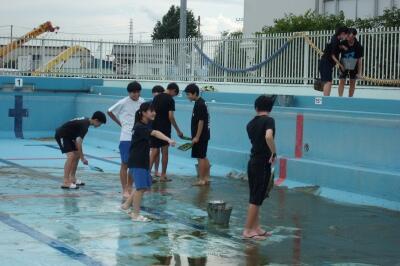 今日は葛飾中学校を会場に、特別支援学級東ブロック地区交流会が開催され、近隣の学校から生徒のみなさんが来校してくれました。大変和やかな雰囲気の中、交流を深めることができました。午後からは、まもなく始まる水泳学習に備えて、プールの清掃を行いました。秋からの長い期間堆積した泥や藻などにより、排水することが大変困難な状態になり、一時は予定通りの開始は厳しいかと思われたものの、事務の先生、体育科の先生たちと、高圧洗浄機などを用いて炎天下に頑張った結果、なんとか目途が立ち、放課後には生活体育委員のみなさんも加わり、おかげさまで大変きれいになりました。明日、もう一度仕上げの作業を行い無事に今年度も水泳の学習が行えます。たくさんの方々のご協力、どうもありがとうございました。