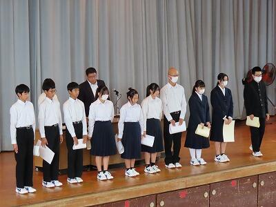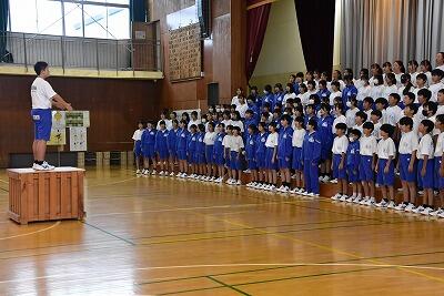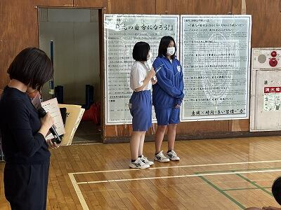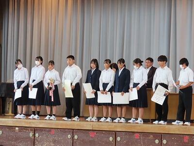 今日、10月10日は、1964年(昭和39年)に開催された東京五輪の開会式でした。その後、「スポーツにしたしみ、健康な心身をつちかう日」として制定された国民の祝日=「体育の日」となりました。令和2年からは「スポーツの日」名称が改められ、今年は10月14日(月)がスポーツの日となっています。今日は、新人戦をはじめ、さまざまな分野で活躍した葛中生たちを全校で讃える表彰式が行われました。