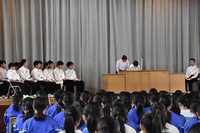 今日は生徒会役員任命式・引継ぎ式が行われました。今まで「葛中魂」あふれる活動で葛飾中学校を牽引してくれた生徒会役員のみなさんがから先日の選挙で決まった新しい役員への引継ぎとその任命式が行われました。旧役員のみなさん今までありがとうございました。新役員のみなさん、強力なリーダシップで葛飾中学校をよろしくお願いします。放課後には明後日に迫った合唱祭のリハーサルが行われました。