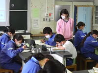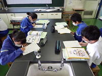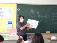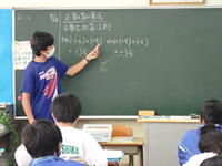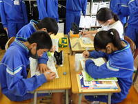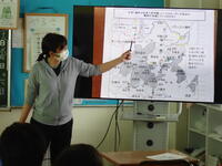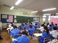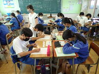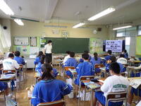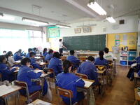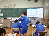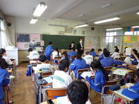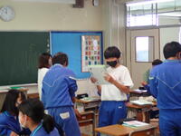 2年生の社会で協調学習(ジグソー法)による授業が行われていました。協調学習とは、「複数の学習者が意見を交換し,協力し合いながら解を導こうとするという学習形態」、要するに「子どもたち同士が教え合い学び合う 」学習のことです。①エキスパート活動(1つの課題について専門的に学習する:今日の場合は「世界の人口」「日本の人口」「日本の人口分布」という課題を班員が1つ担当し、調べ上げる活動)、②ジグソー活動(班員がそれぞれ調べ上げた課題を、ジグソーパズルのようにまとめ上げる活動)、③クロストーク活動(ジグソー活動でまとめた内容で学習課題(日本の人口は、世界と比べてどのような特色があるか?)に迫る活動)という流れで授業を展開しました。生徒は、資料を用いて一生懸命調べたり、調べたものを必死に他の班員に伝えていました。この活動がまさしく対話を通して理解を深めるアクティブラーニング型授業です。