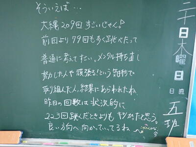 予行の後に、「全校プレ大縄大会」を開催しました。全校一斉で行ったためか、どのクラスも「気持ち」が入り、新記録を出したクラスも多く、300回を超えるクラスが2クラスもありました。