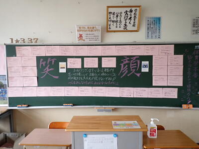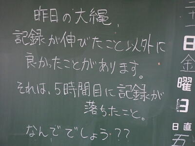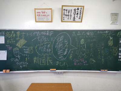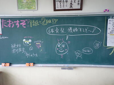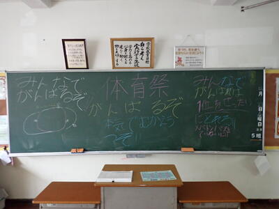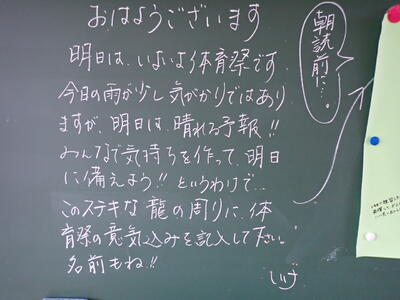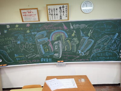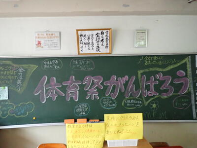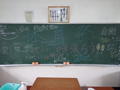 朝、各教室を回っていたら、全てのクラスで体育祭に向けての意気込みが書いてありました。どれだけ熱い思いを持って臨んでいるかがわかります。