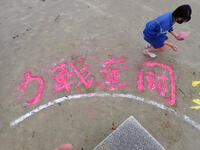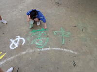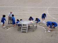 美術部が朝礼台前装飾、陸上部がライン引きです。