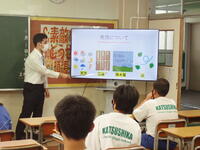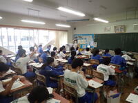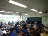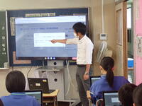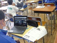2年生の数学では、登校しているBグループの生徒だけでなく、在宅しているAグループの生徒がリモートで授業に参加しました。オンライン授業と対面授業を組み合わせて実施する、いわゆるハイブリッド型授業の試行です。先生は対面するせいただけでなく、オンライン上生徒にも発問したり、発言させたりしていました。