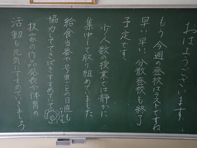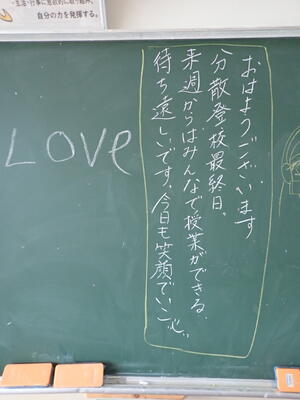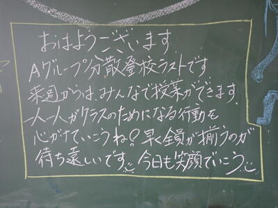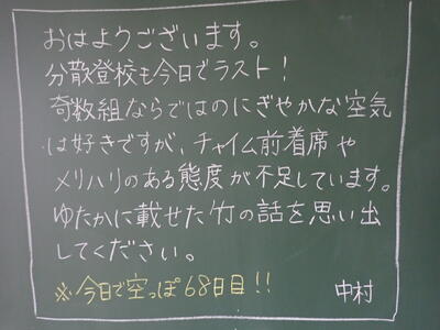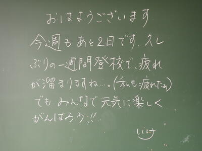 今日は久々に真夏日になりましたね。いつも涼しかったので余計に暑く感じました。こういうときこそ体調管理をしっかりしましょう。また、分散登校が今日で終わります。来週から通常登校です。とっても楽しみです。
