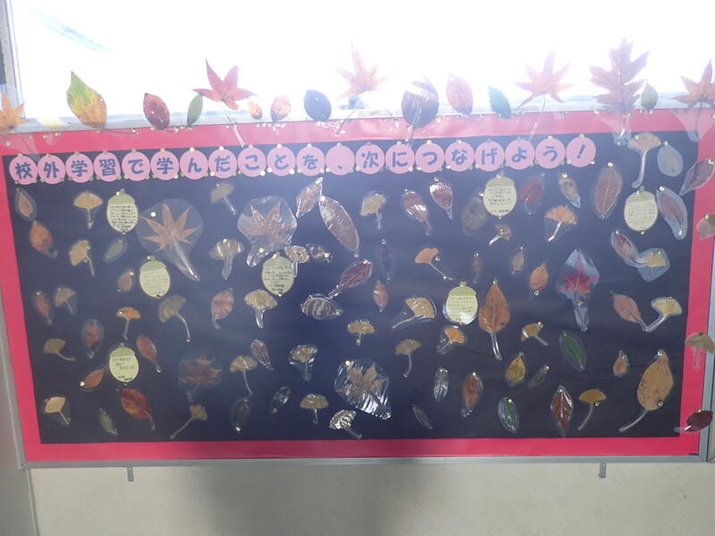 1年生が校外学習の時に集めてきた落ち葉です。いろいろな種類があります。紅葉しているものもありました。