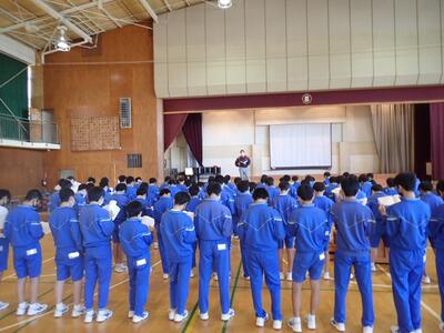 体育館から美しい歌声が聞こえてきたので、行ってみると3年生が学年パート別練習をしていました。マスク越しですが、「さすが3年生」という歌声を聞かせてくれました。
