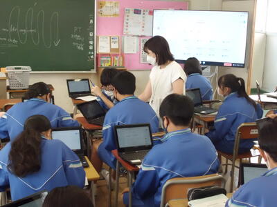 2年生の家庭科で、普段は給食センターでお仕事をしている栄養教諭の先生が授業をしてくれました。班ごとにタブレットを活用し、バランス良い献立を考えていました。