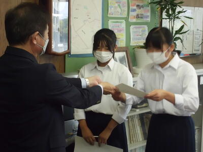 先日の新生徒会役員選挙により新役員が決定しました。今日は、テストを終えた全校生徒に新役員のお披露目と新旧役員による引き継ぎ式を行いました。新役員のみなさん、上昇中の葛飾中をよろしくお願いします。生徒の皆さん、ご協力をお願いします。