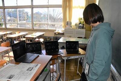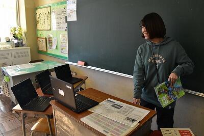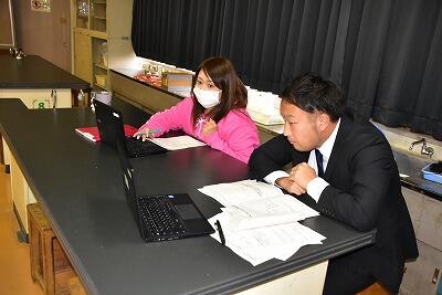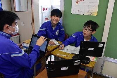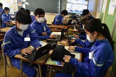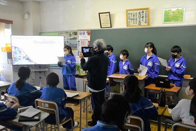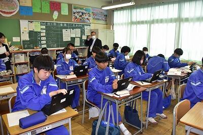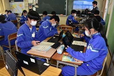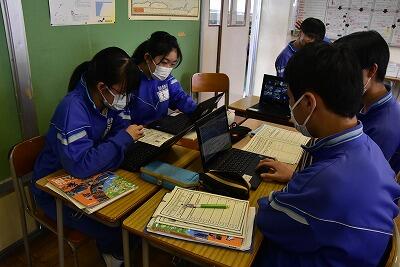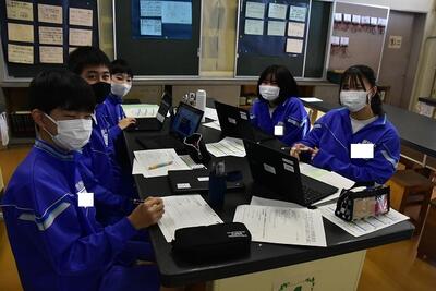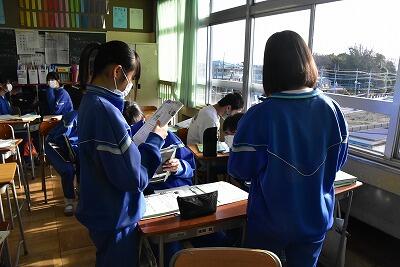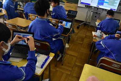 今日は指導者の先生にお越しいただき、道徳の授業研究会が行われました。授業の中でグループごとに春日部市、庄和地区について知っていることやその魅力について、学習用タブレットやインターネットを駆使しながら意見を交わしていました。