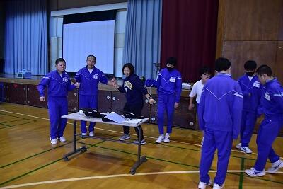 今日は春日部市と連携協定を締結している越谷アルファーズから、喜多川 修平選手とチームスタッフの方が『令和5年度「アルファーズ元気キャラバン-朝のあいさつ/春日部編-」の取り組みで葛飾中学校に来てくださいました。葛飾中学校では、生徒会本部役員・バスケットボール部のみなさんが、一緒にあいさつ運動を行い、朝の校門は元気のよい挨拶の声があふれていました。