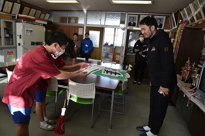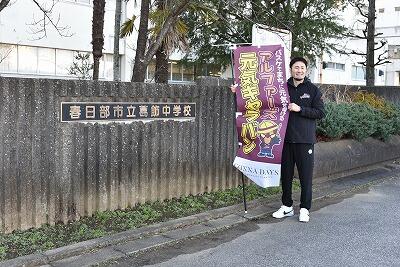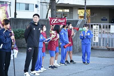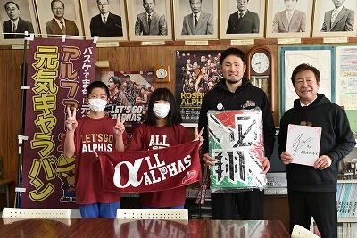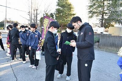 今日は春日部市と連携協定を締結している越谷アルファーズから、喜多川 修平選手とチームスタッフの方が『令和5年度「アルファーズ元気キャラバン-朝のあいさつ/春日部編-」の取り組みで葛飾中学校に来てくださいました。葛飾中学校では、生徒会本部役員・バスケットボール部のみなさんが、一緒にあいさつ運動を行い、朝の校門は元気のよい挨拶の声があふれていました。