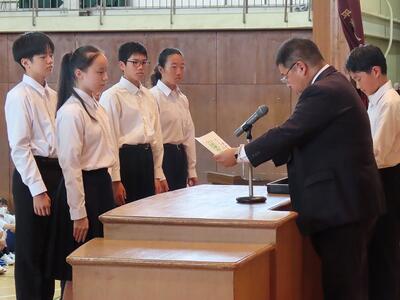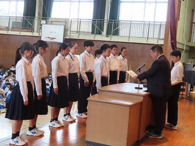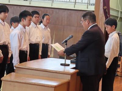 今日は生徒会役員任命式・引継ぎ式が行われました。今まで「葛中魂」あふれる活動で葛飾中学校を牽引してくれた生徒会役員のみなさんがから先日の選挙で決まった新しい役員への引継ぎとその任命式が行われました。旧役員のみなさん今までありがとうございました。新役員のみなさん、強力なリーダシップで葛飾中学校をよろしくお願いします。放課後には明後日に迫った合唱祭のリハーサルが行われました。