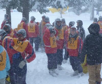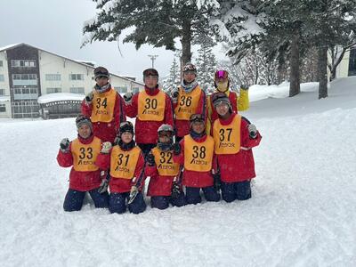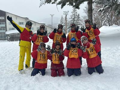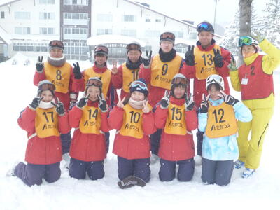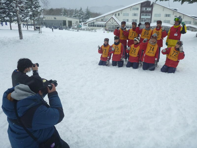 午前のスキー講習が始まる前に外で集合写真を撮ります。