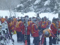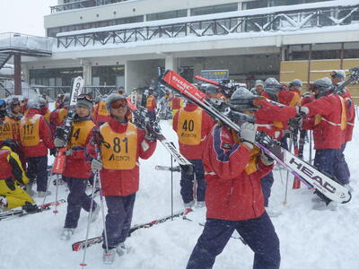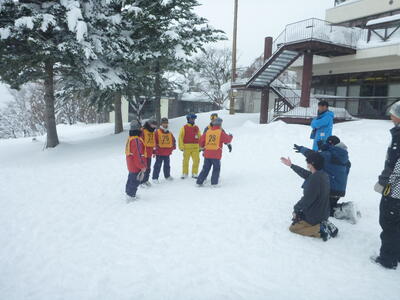 午前中のスキー講習を終えて、ホテル前ではスキー班別の記念撮影です。