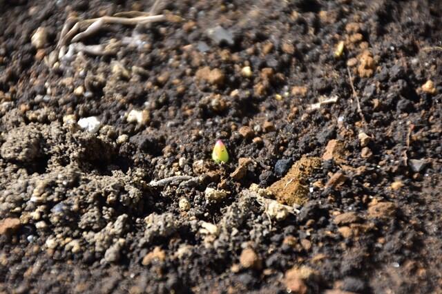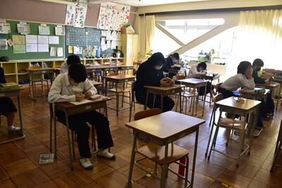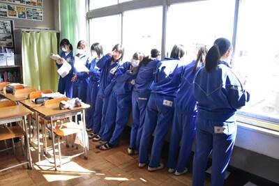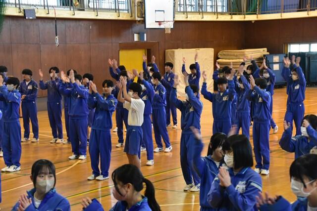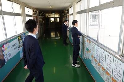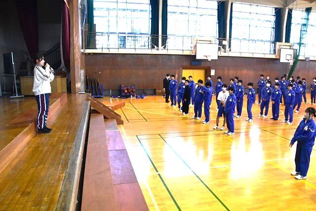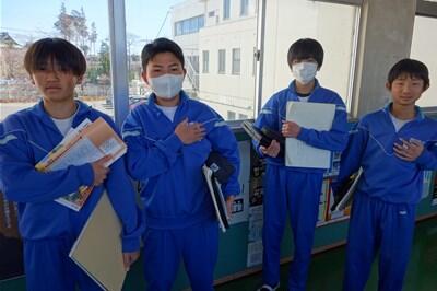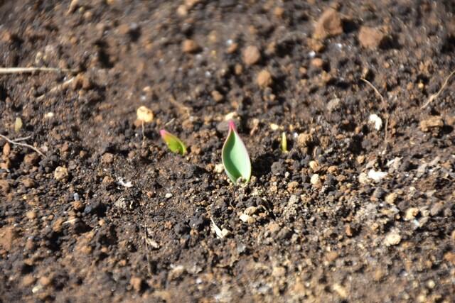 ボランティア活動「チューリップを咲かせ隊」で植えたチューリップが、昨日今日の暖かさもあるのか、かわいい芽を出しました。1・2年生は期末テスト2日目、3年生は体育館に集まって活動していました。