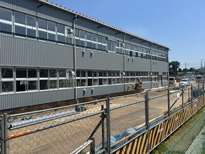 校庭に建築中の仮設校舎を覆っていたシートが外され、校舎の全容があきらかになってきました。中庭と体育館の大掛かりな工事は雨の中、行われています。