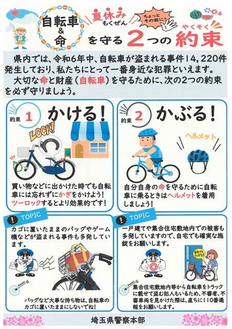 夏休みになり、日頃よりも自転車に乗る機会も多くなることと思います。ヘルメット着用の徹底や並列走行の厳禁とともに、大切な自転車を盗難の被害から守りましょう!