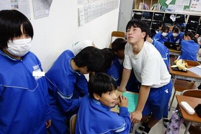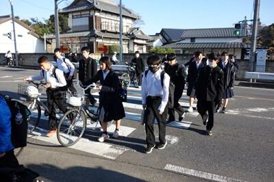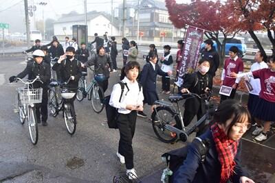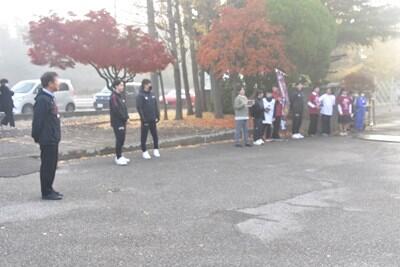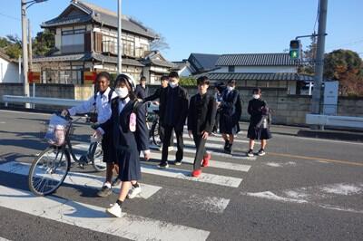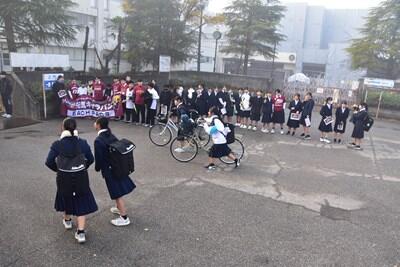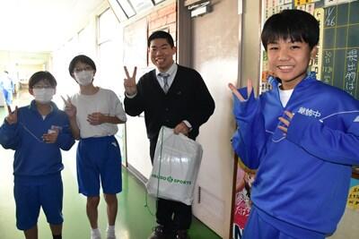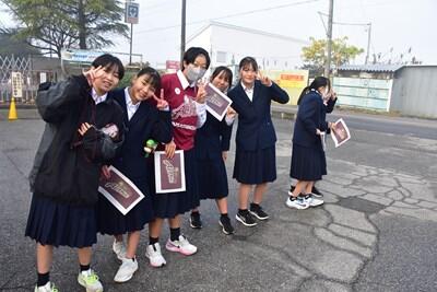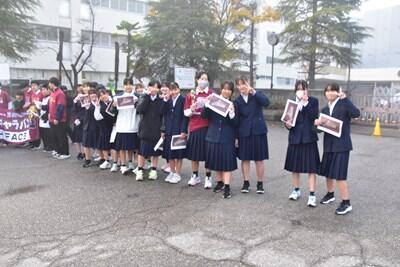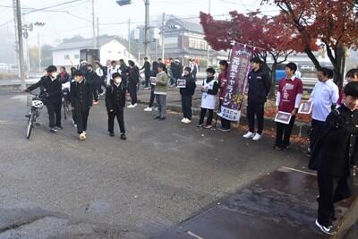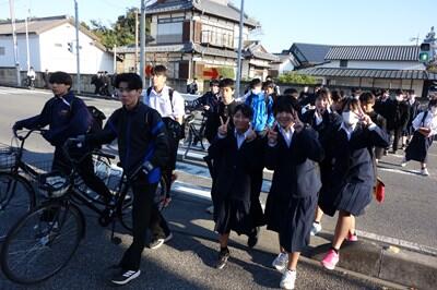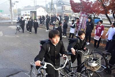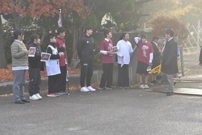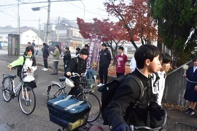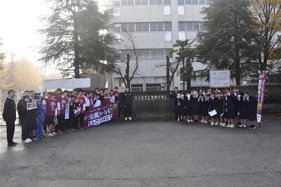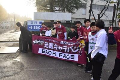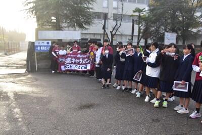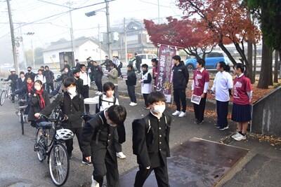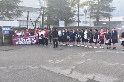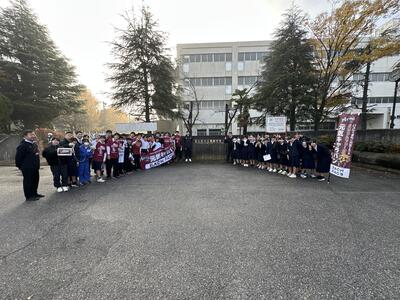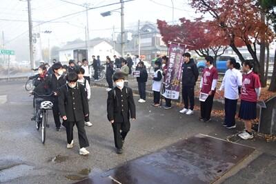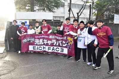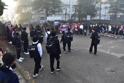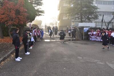 越谷アルファーズ「元気キャラバンー朝のあいさつ」でプロバスケットボールチーム「越谷アルファーズ」から四家魁人選手とチームスタッフの方々が朝のあいさつ運動のために来校されました。葛飾中学校からは、男女バスケットボール部のみなさん、生徒会本部役員、野田前校長先生、本校職員があいさつ運動に参加しました。深い霧に包まれた中、元気のよいさわやかな挨拶の声が響く素敵な朝となりました。