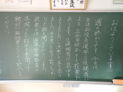 午後は、生徒会本部役員選挙がありました。11名の立候補者の立ち会い演説があり、葛飾中をよりよくするために具体的な公約を掲げてくれました。生徒会は生徒全員が主役です。本部役員を中心にみんなで取り組んでいきましょう。