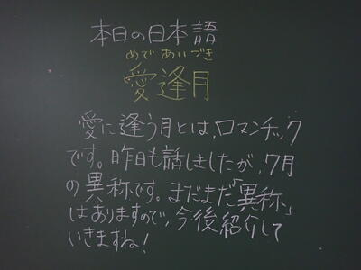 今日の日本語は「愛逢月(めであいづき)」です。 七夕の牽牛(けんぎゅう)・織女(しょくじょ)が互いに愛して会うという月だそうです。七夕にちなんだ 7月の異称です。