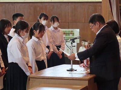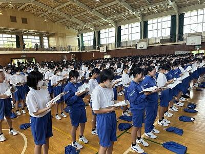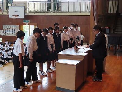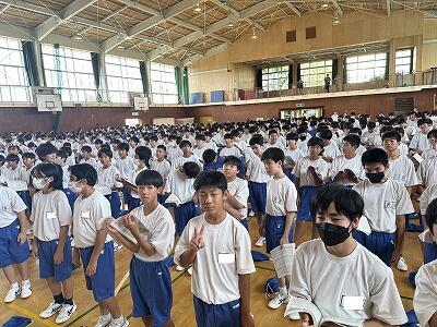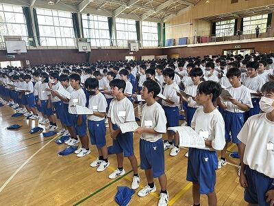 今日、10月10日は、1964年(昭和39年)に開催された東京五輪の開会式でした。その後、「スポーツにしたしみ、健康な心身をつちかう日」として制定された国民の祝日=「体育の日」となりました。令和2年からは「スポーツの日」名称が改められ、今年は10月14日(月)がスポーツの日となっています。今日は、新人戦をはじめ、さまざまな分野で活躍した葛中生たちを全校で讃える表彰式が行われました。