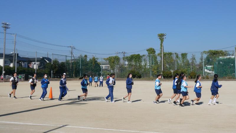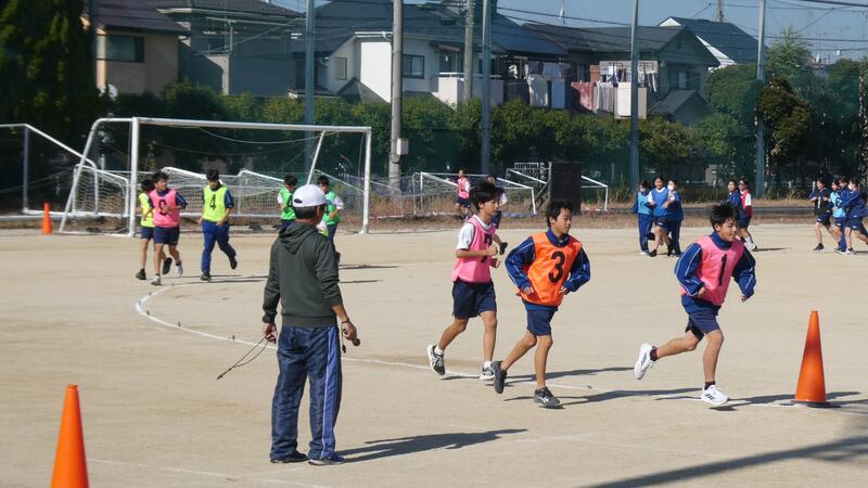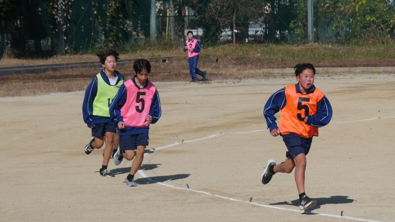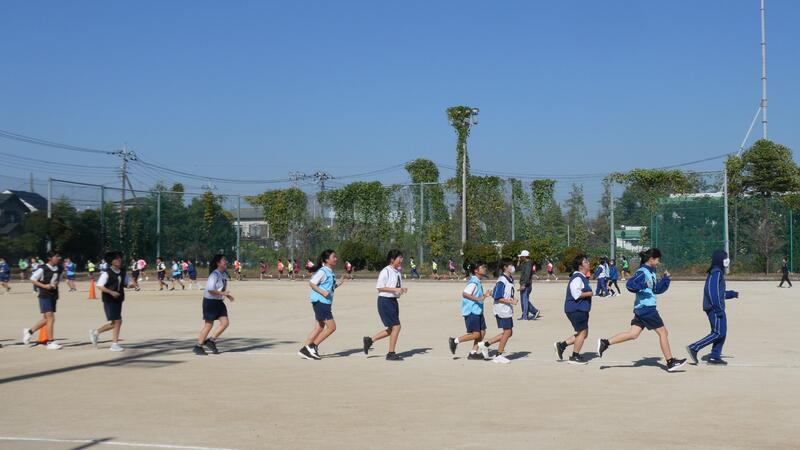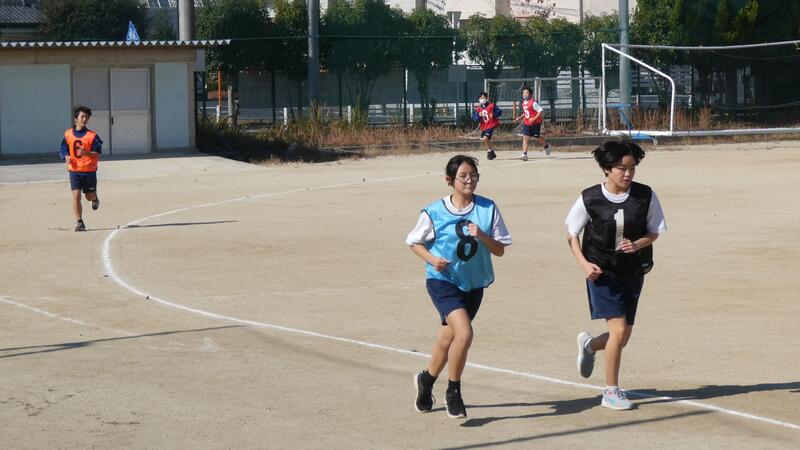 先週1日半学級閉鎖になった1年2組も今日は元気に体育の授業で持久走に取り組んでいました。