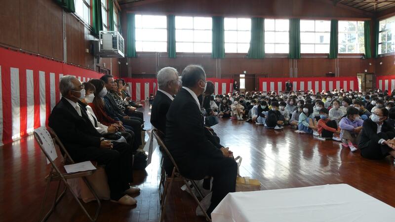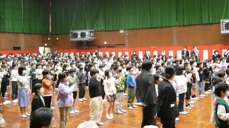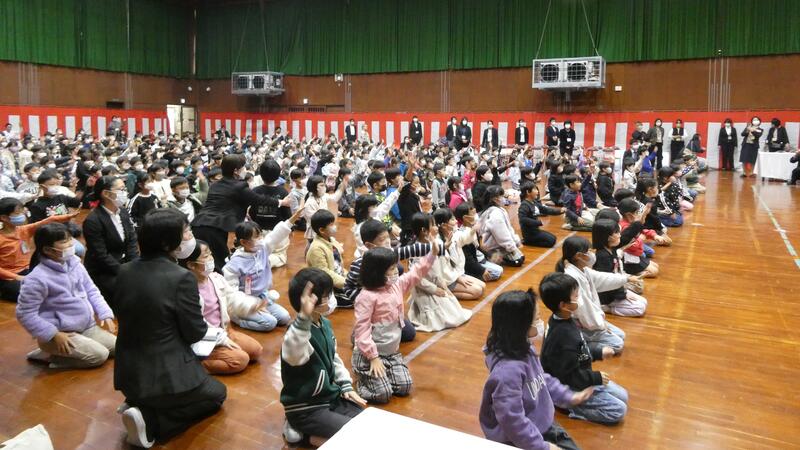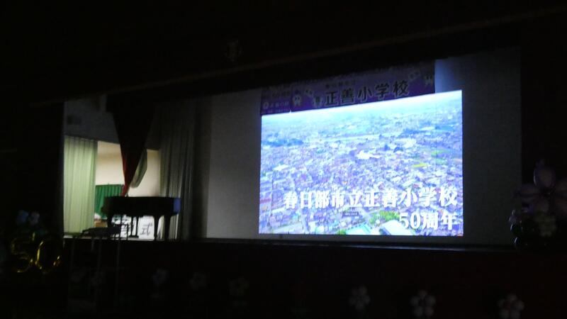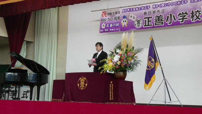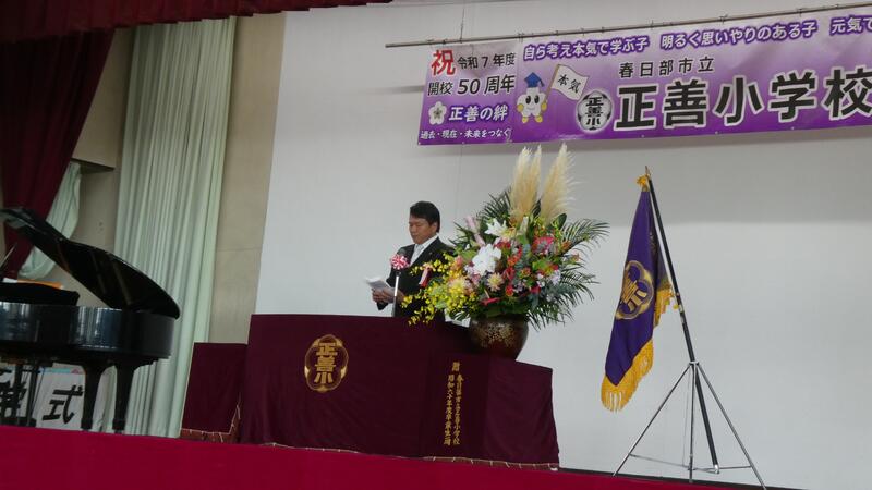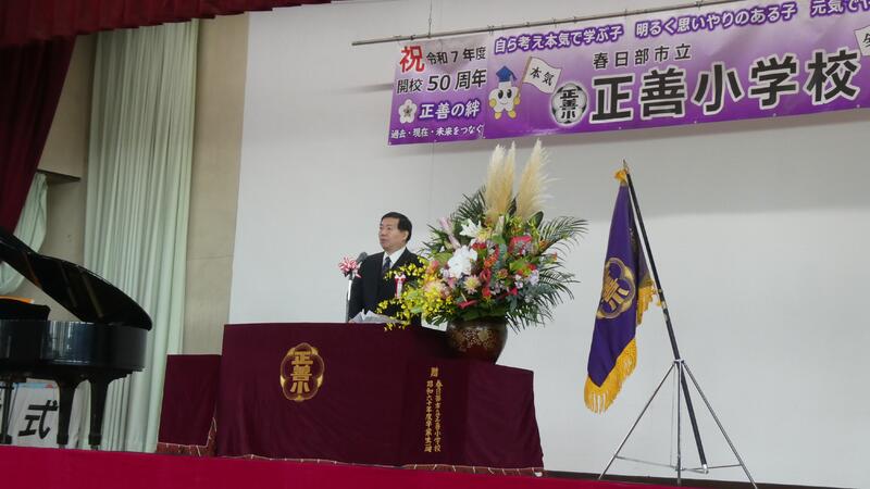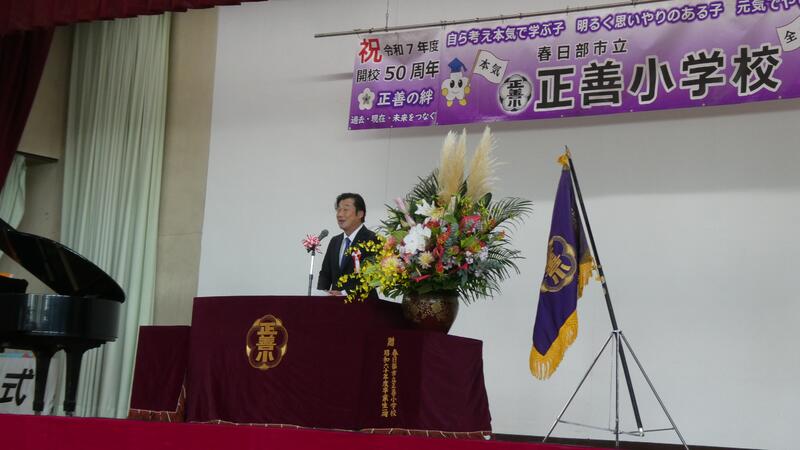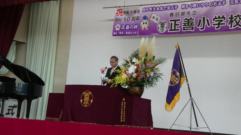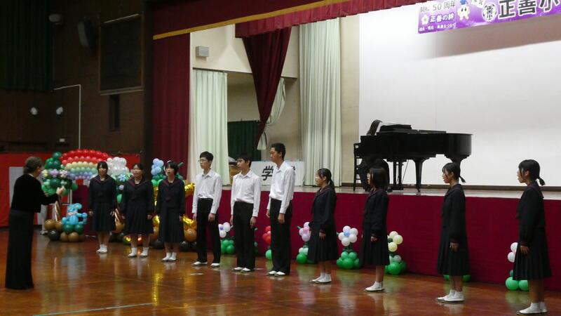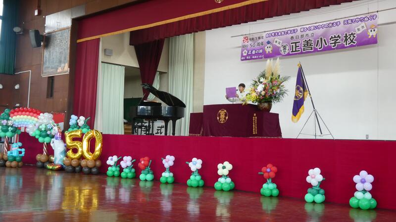 本日午前中、正善小学校創立50周年記念式典が開催され、本校の有志合唱団が第二部のアトラクションから出演しました。第一部式典の様子からお伝え致します。