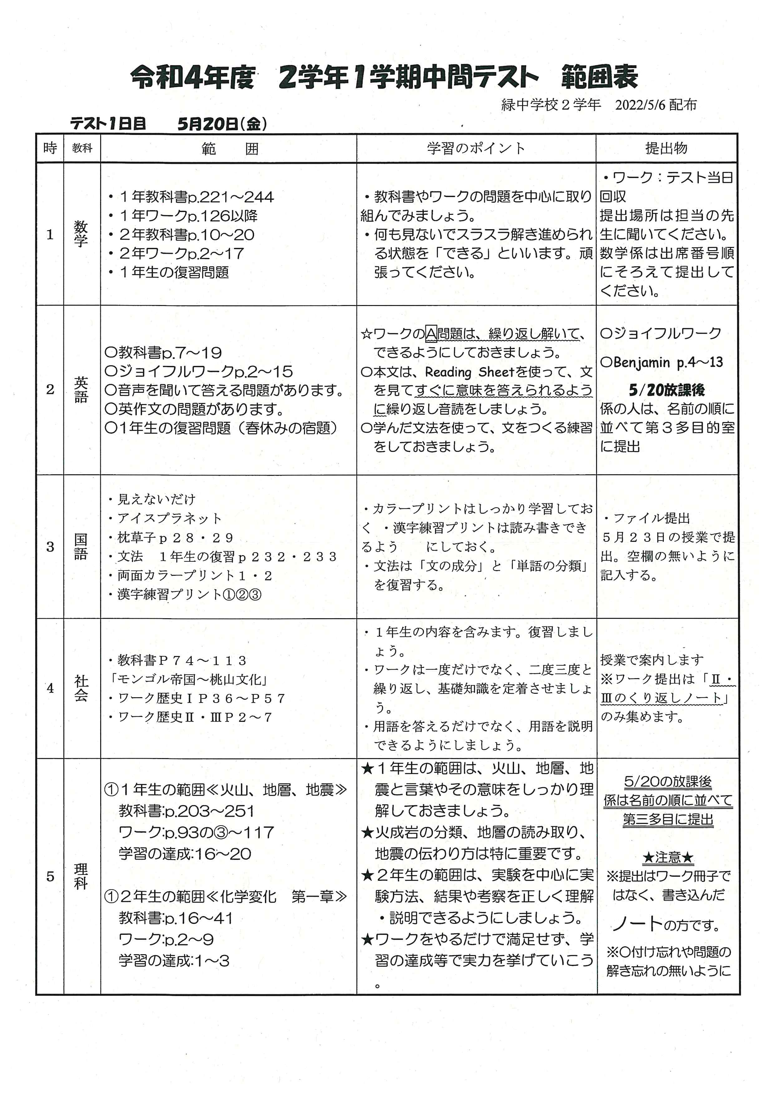2年1組の皆さんへ 1学期中間テストの範囲表です。