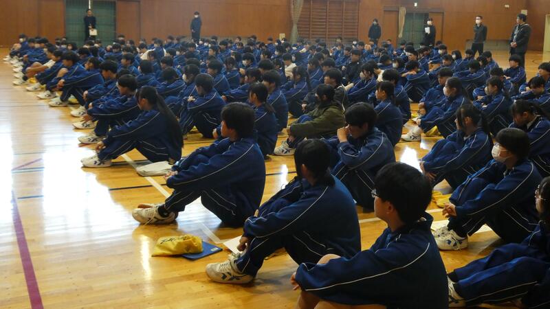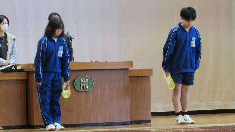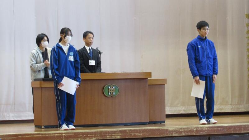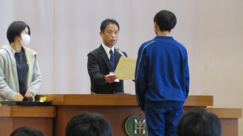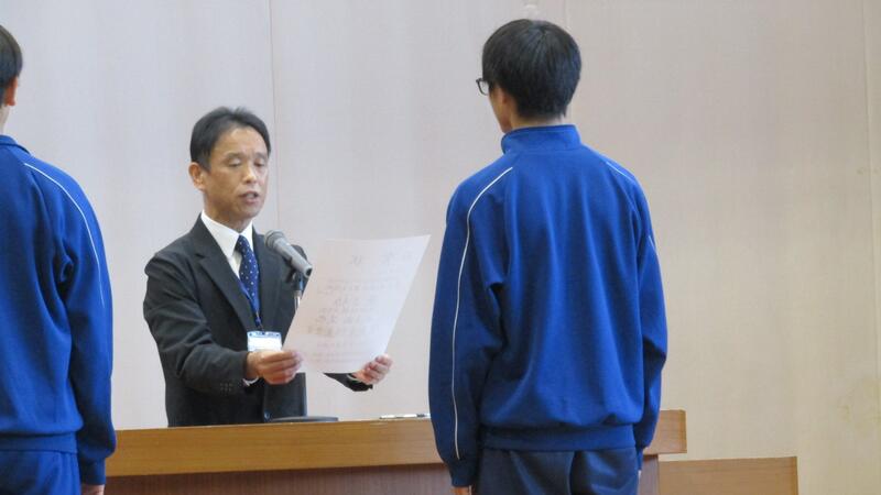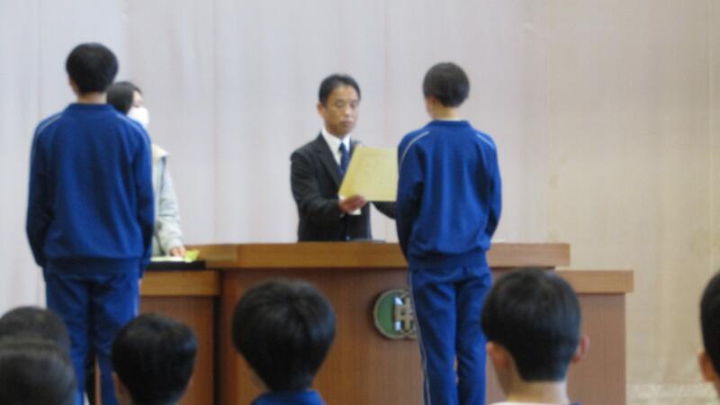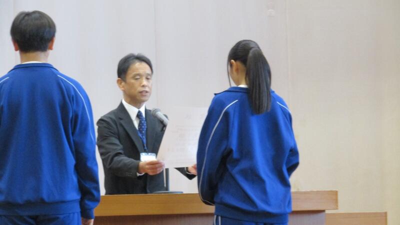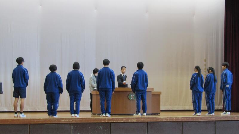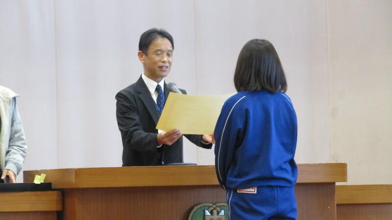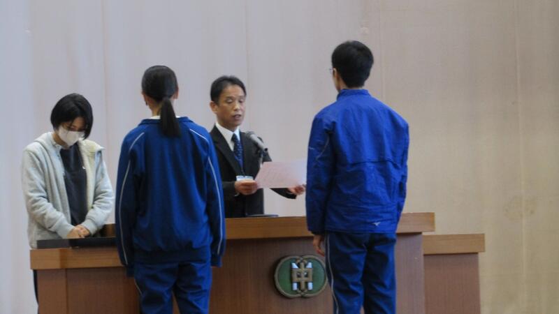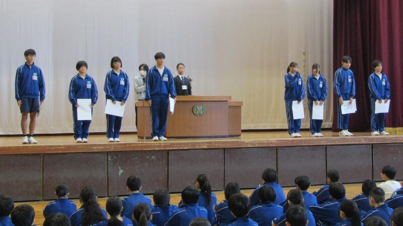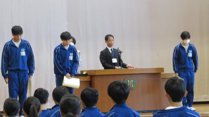 今日から12月、2学期のまとめの月になりました。校長からは「相手に与える印象」についての話をいたしました。内容は本日配布した学校だより12月号をご覧ください。表彰では、陸上競技部の子たちを筆頭に、たくさんの生徒たちの活躍を振り返ることができました。