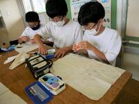 3年生の数学の授業の様子です。黙々と小さなトレー状のものを作っています。あれ?工作の時間?いえいえ、これは、2次方程式の利用の学習です。「容積(=体積)が96㎤である」ことを利用して、2次方程式を作りましょう。問題文をよりよく理解する上で、模型を作ってみました。平面だと理解しにくいところですが、小さな模型があると「容積」のイメージがよくわかりますね。