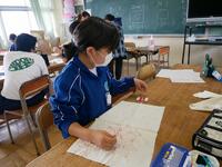 4・5・6組の家庭分野の授業の様子です。刺し子で作品づくりに取り組んでいます。麻の葉模様がだんだんと出来上がってきました。麻の葉模様は伝統的な文様のひとつです。同じ模様でも、部分的に糸の色を変えると雰囲気が変わりますね。ちくちく、ちくちく。細かい作業に黙々と取り組みます。