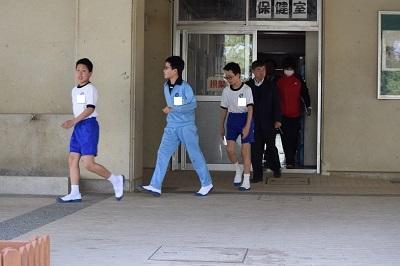 緊急地震速報のアナウンスで、第1次の避難行動をとった後、緊急避難場所(校庭)への避難指示の放送に従って、全校生徒と全教員が第2次避難行動をとる訓練でした。
