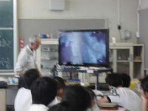 理科室を訪問すると、教室全体から「すごーい、これ何?」感動の声が上がりました。教員がある植物の葉の裏側をカメラで拡大して映し出していました。