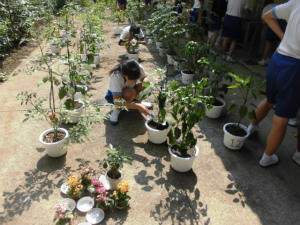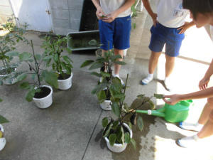 技術の授業では、栽培について学習しています。授業の前半には、今が学習している知識がどのように社会で活用されているか、視聴覚教材を使って学習し、その後、各自が自分の手で作物の手入れを行いました。3日間、修学旅行で見ていませんでしたが、大きくなっている姿に驚いていました。