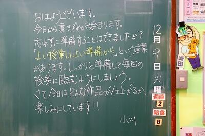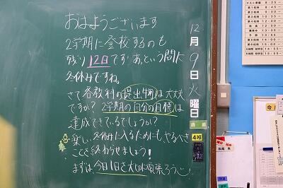 12月も第2週目となり、登校日も残すところ13日となりました。朝晩の寒さも厳しくなりました。先週は2年生がインフルエンザの蔓延により3日間の学年閉鎖となりました。また、先週は新入生一日入学が行われ、地域の6年生が来校しました。一日一日、1つ1つが確実に進み、2学期のゴールが見えてきました。まずは健康第一です。風邪やインフルエンザに気をつけましょう。また、3学期には、1年生はスキー教室、2年生は東京校外学習、3年生はいよいよ受験が控えています。2学期の残りと冬休みも気を緩めることなく、行事の準備や学習をがんばっていきましょう。(校長)