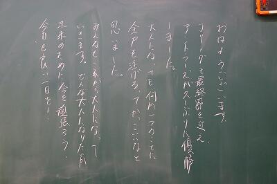 明日、明後日は進路検討会議が予定されています。これは3年生の生徒一人一人の現在の志望校やこれまでの成績などを3学年の先生方はもちろん、多くの先生方で確認し、以後適切な進路指導ができるように確認をする、時間のかかる大切な会議です。校長以下、全教職員の願いは、卒業生全員が来春、希望を胸に大沼中学校を巣立ってゆくことです。しかし、どうだろう…、3年生はいま全員が本当に精一杯のがんばりをしているだろうか…。これまでの3年間の学校生活を思い起こしてほしい。授業、部活動、学校行事とたくさんの経験をしてきたこと、そしてそれらは君たちが中学校を卒業後に力強く社会で生きていけるための力をつけることが目的だったはずです。辛くて厳しい、進路を切り拓くための努力が求められるこの期間も、仲間と共にがんばることができるように絆を深めてきたはずだ。しかし、進路のことから目を背け、仲間とたわいもない遊びをすることで時間を無駄に使い、進路活動から逃げている者がいる。懸命にがんばっている仲間や、心配し、応援してくださっている保護者や先生方への裏切り行為にも等しいと思いませんか…。しっかりしなさい。(校長)